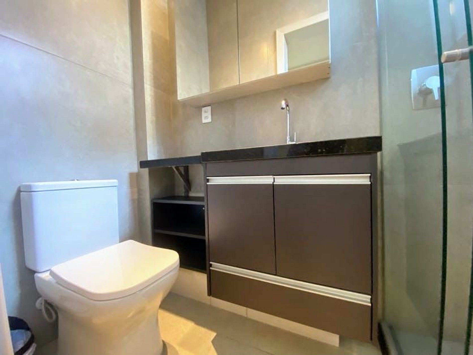- Banheiro com acabamento em porcelanato de cimento queimado.
