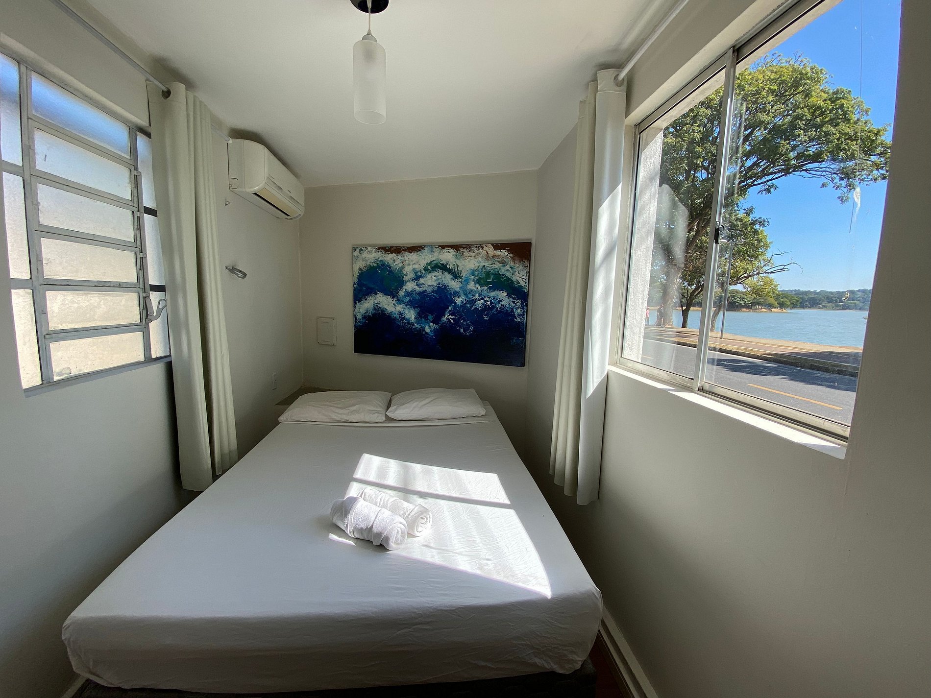 Embora compacto, o espaço é muito funcional e conta com tudo que você precisa para uma estadia confortável: televisão, ventilador, sabonete e papel higiênico. A janela proporciona uma vista deslumbrante para a Lagoa, criando um ambiente relaxante. Aproveite ainda a área externa com piscina para momentos de descontração!