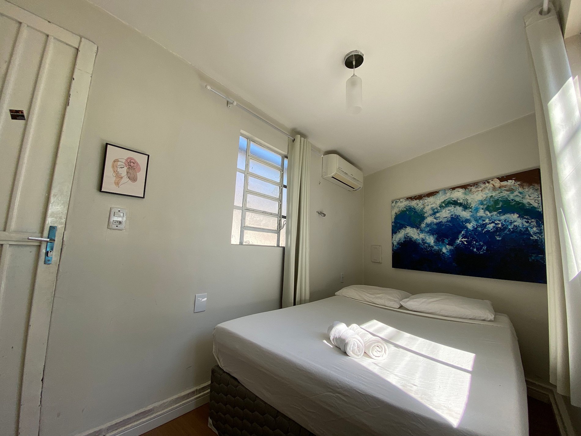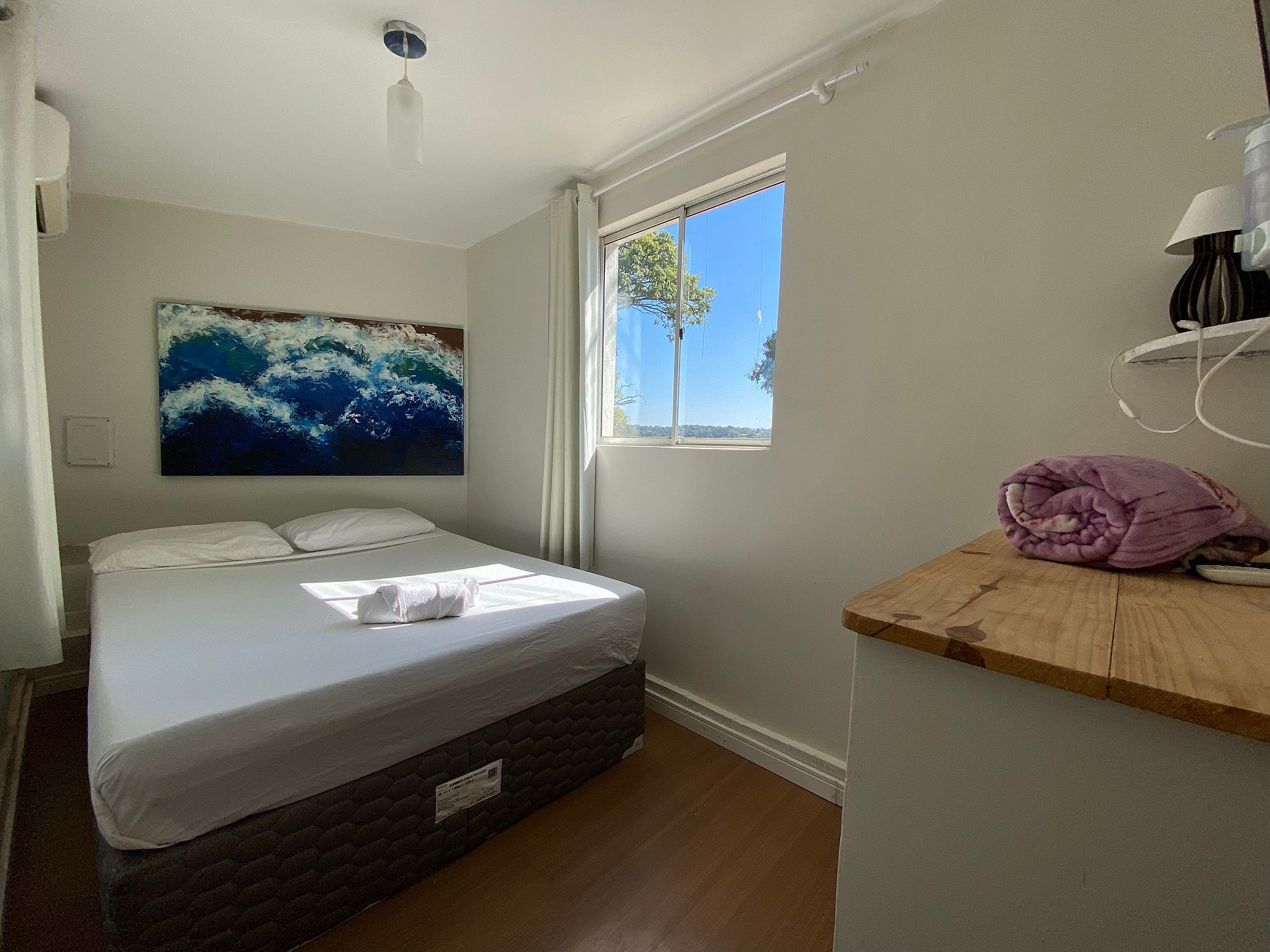 Embora compacto, o espaço é muito funcional e conta com tudo que você precisa para uma estadia confortável: televisão, ventilador, sabonete e papel higiênico. A janela proporciona uma vista deslumbrante para a Lagoa, criando um ambiente relaxante. Aproveite ainda a área externa com piscina para momentos de descontração!