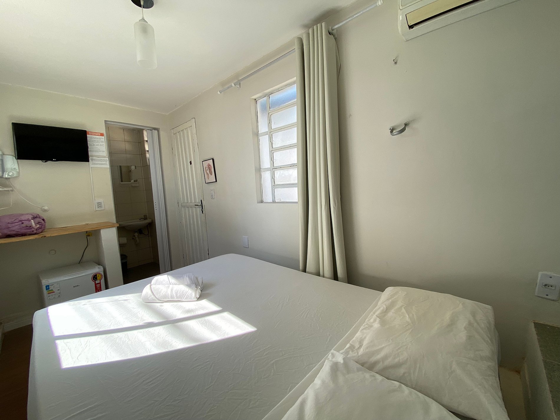 Nossa suíte aconchegante é ideal para até 2 pessoas, equipada com cama de casal, banheiro privativo, ar condicionado e frigobar. O ambiente simples, mas acolhedor, garante uma estadia agradável.
