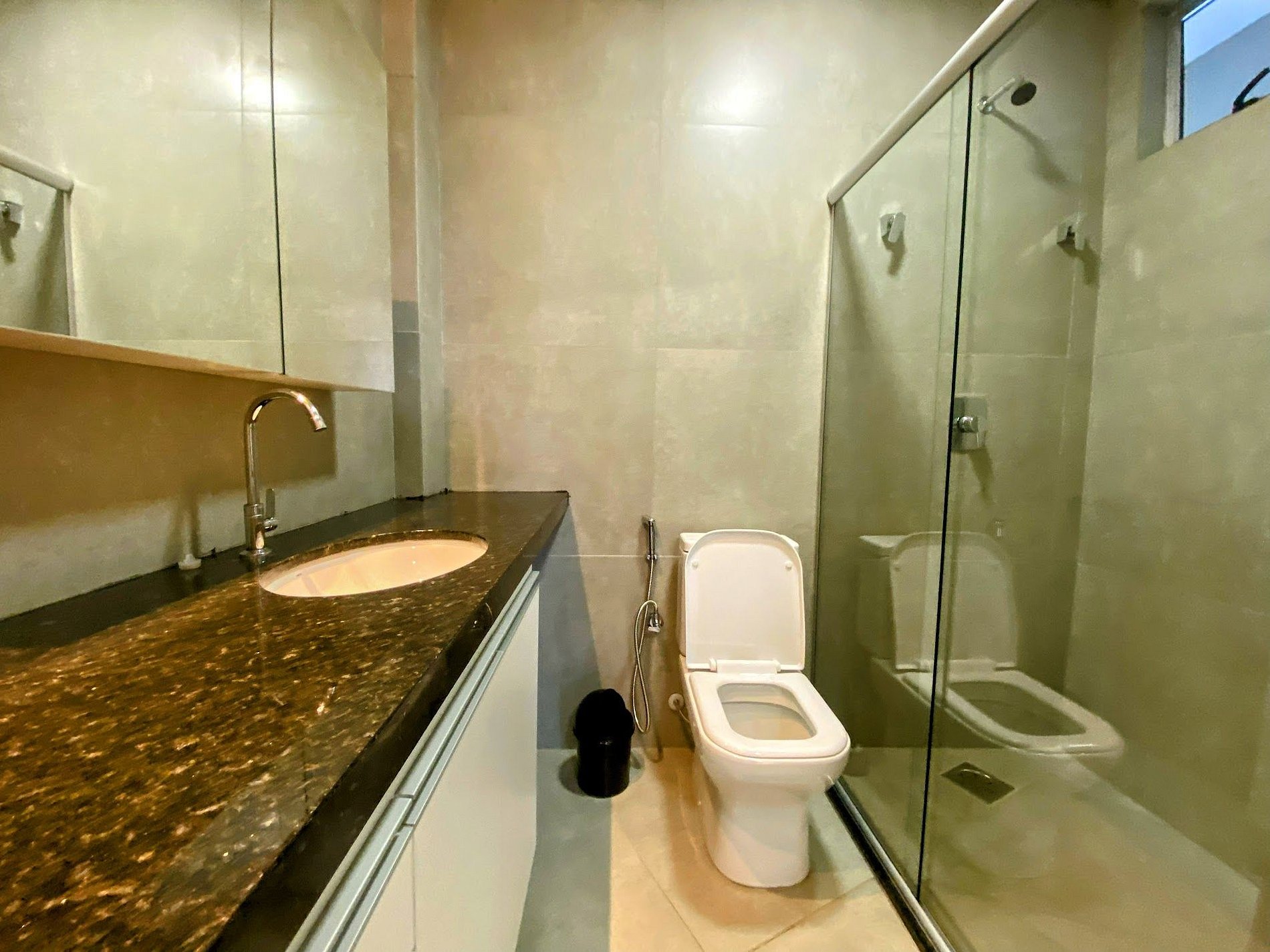 - Banheiro com acabamento em porcelanato de cimento queimado.